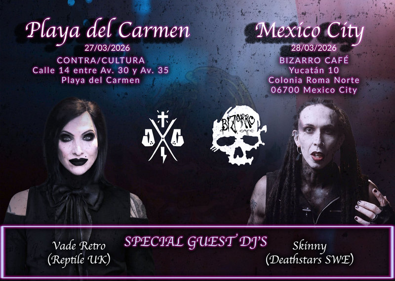 “The day has come, me and my good friend Vade Retro (REPTILE) are finally on our way to Mexico for our long awaited mini DJ-tour. We can’t wait to see you all. Friday 27/3 Contra/Cultura, Playa del Carmen. With Resident DJs: ESA FLAIS & COD3X. Surprise appearance by W. Sigma from Mexico City. Saturday 28/3 Foro Bizarro, Mexico City. With resident DJ’s: DJ Mort & Jenny Stillman. Special performance by: Lilith MakabrA.”